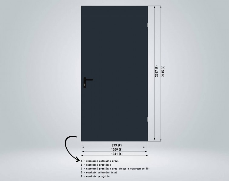 Drzwi są dostępne w wymiarach zewnętrznych (ramy): 741x2115 mm, 770x2010 mm, 841x2115 mm, 895x2010 mm, 941x2115 mm, 1041x2115.